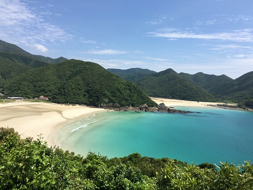 接着,我们来到了高滨海水浴场。这里的白色沙滩长约800米,钴蓝色的海水在每年的检查中总是保持着优良的水质,这里被选为“日本的海岸百选”、“海水浴场百选”、“日本的海水浴场88选”。从海滩步行约10分钟,我们来到“鱼蓝观音展望所”,从这里可以看到海水呈现出的不同渐变色彩,令人心旷神怡。